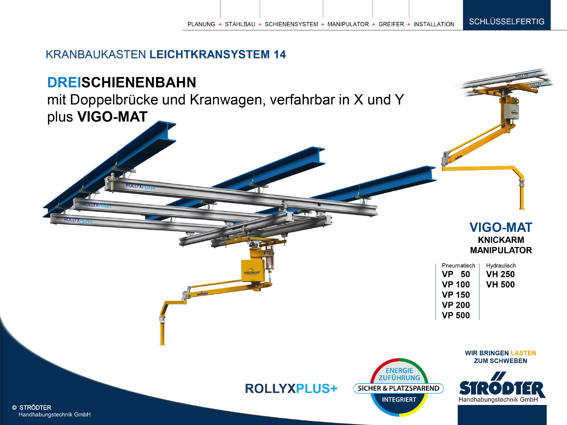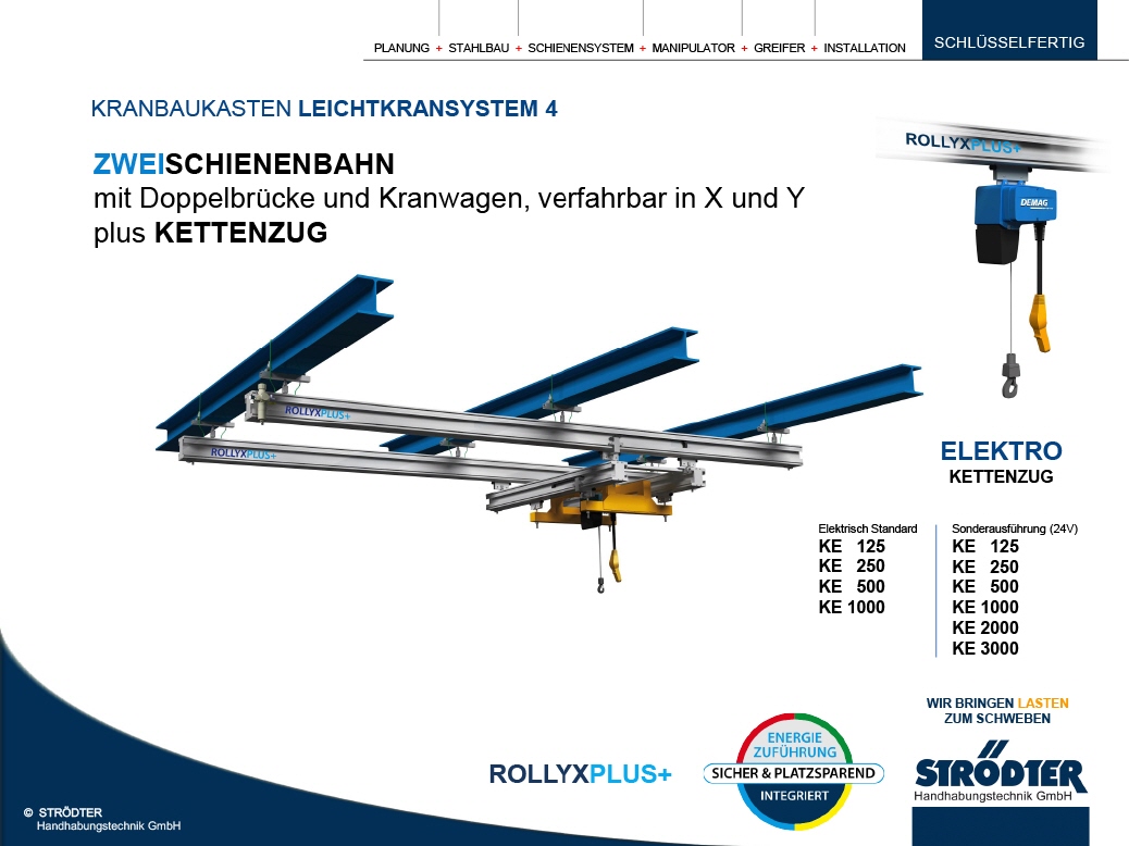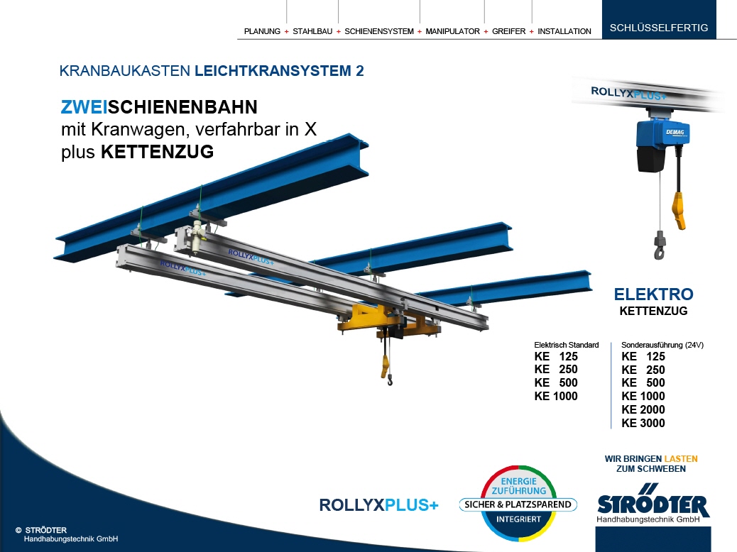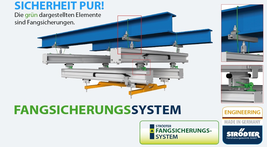 Die Firma STRÖDTER hat mit der Einführung des ROLLYX-Schienensystems im Jahr 2002 als erstes Unternehmen Seilsicherungen für unvorhersehbare Fälle eingeführt. Es basiert auf dem Prinzip, dass bei Versagen eines Schienenelements, z.B. einer Aufhängung in der Seilsicherung, eine Schiefstellung der Laufschienen und der Hebezeuge erzeugt und deren Funktion dadurch beeinträchtigt wird.