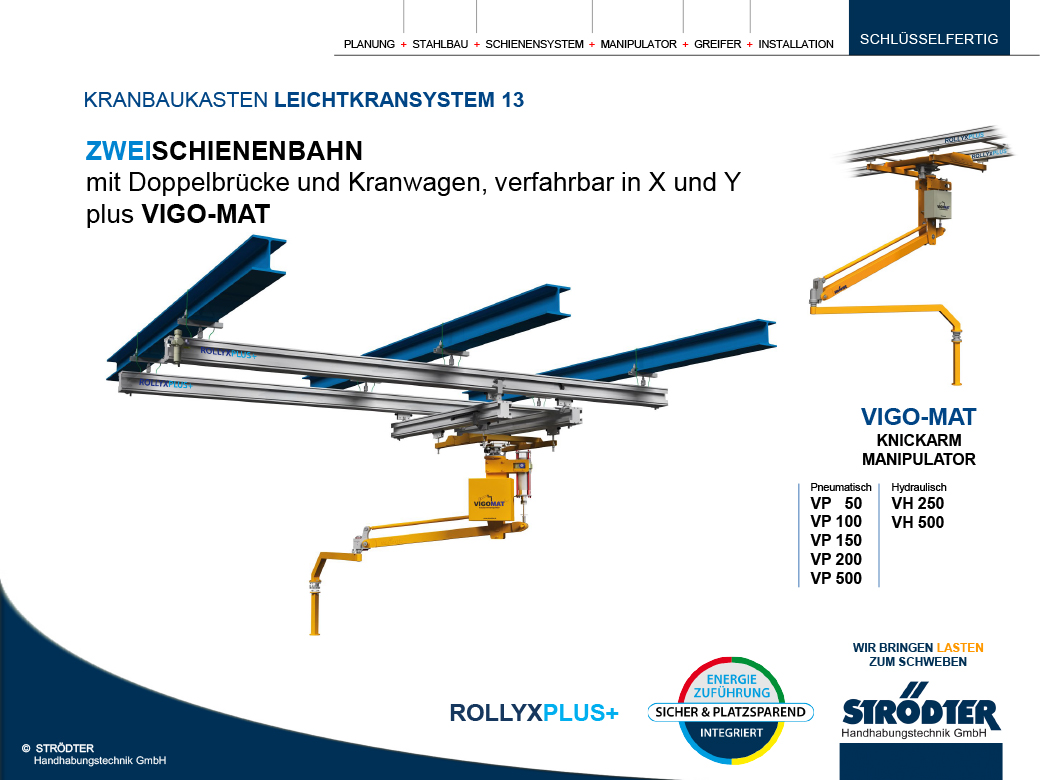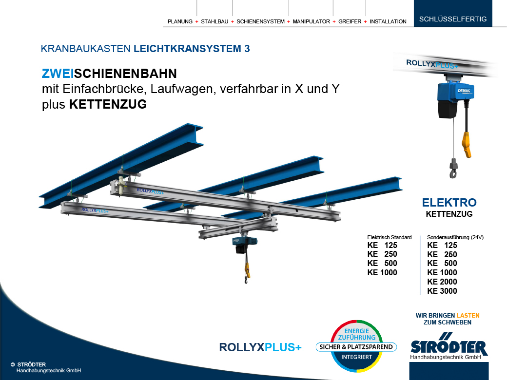 Das ROLLYXPLUS+ Aluminiumschienensystem ist ein modulares Baukastensystem, das zur Erstellung von Schienenbahnen und X/Y-Leichtlaufkrananlagen entwickelt wurde. Es bietet ausgezeichnete Laufeigenschaften für Traglasten bis zu 3000 kg. Mit dem ROLLYXPLUS+ Baukasten lassen sich Hängekrananlagen und Manipulatoren-Schienensysteme einfach und schnell konstruieren.