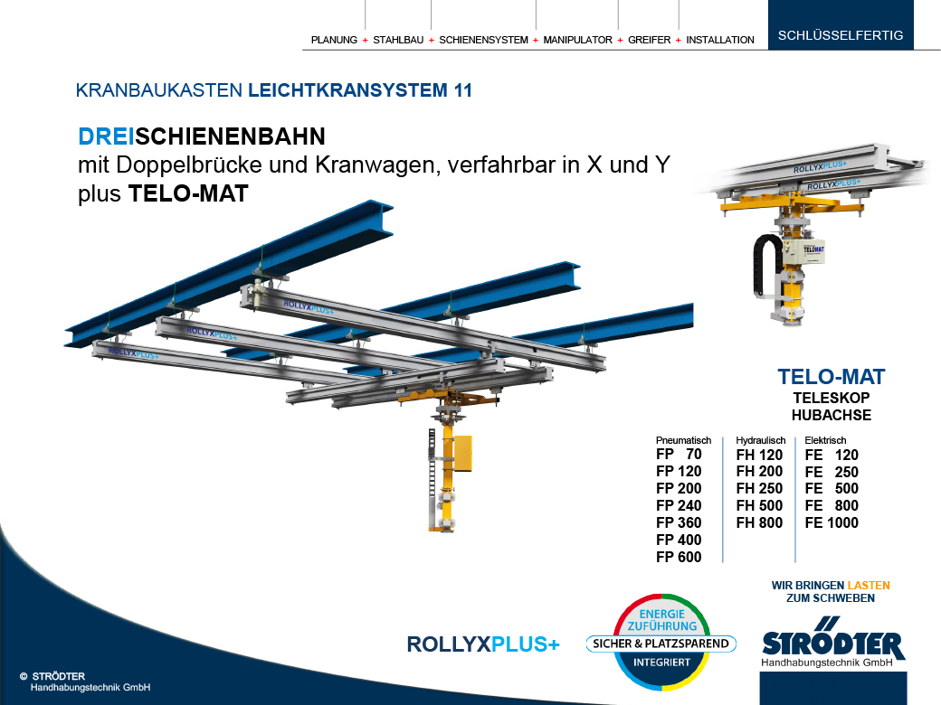 Mit der innovativen ROLLYXPLUS+ Lösung von STRÖDTER werden Schläuche und Kabel platzsparend und ohne Störungen in der Schiene geführt. Dies stellt einen bedeutenden Fortschritt für die Handhabungstechnik der Zukunft dar, da die bisherigen Probleme durch heraushängende Energiezuführungen an den Schienenbahnen beseitigt sind.