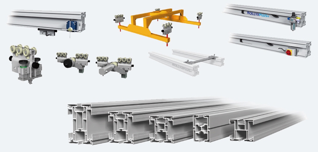 Das ROLLYXPLUS+ Schienensystem lässt sich einfach an individuelle Aufgabenstellungen anpassen. Als Basis dient ein harteloxiertes Mehrkammer-Präzisionsaluminiumprofil in fünffacher Stabilitätsabstufung. Spezielle Laufwagen mit kugelgelagerten Kunststofflaufrollen und Seitenführungsrollen gewährleisten ein verkantungsfreies Laufverhalten mit höchster Laufruhe und überragendem Leichtlauf. Komplettiert wird das System durch eine Vielzahl an Zubehörkomponenten wie Universalaufhängungen, Schienenverbindungs- und Abschlusssets sowie verschiedene Energiezuleitungskomponenten (Stromschienen, Kabelketten etc.).